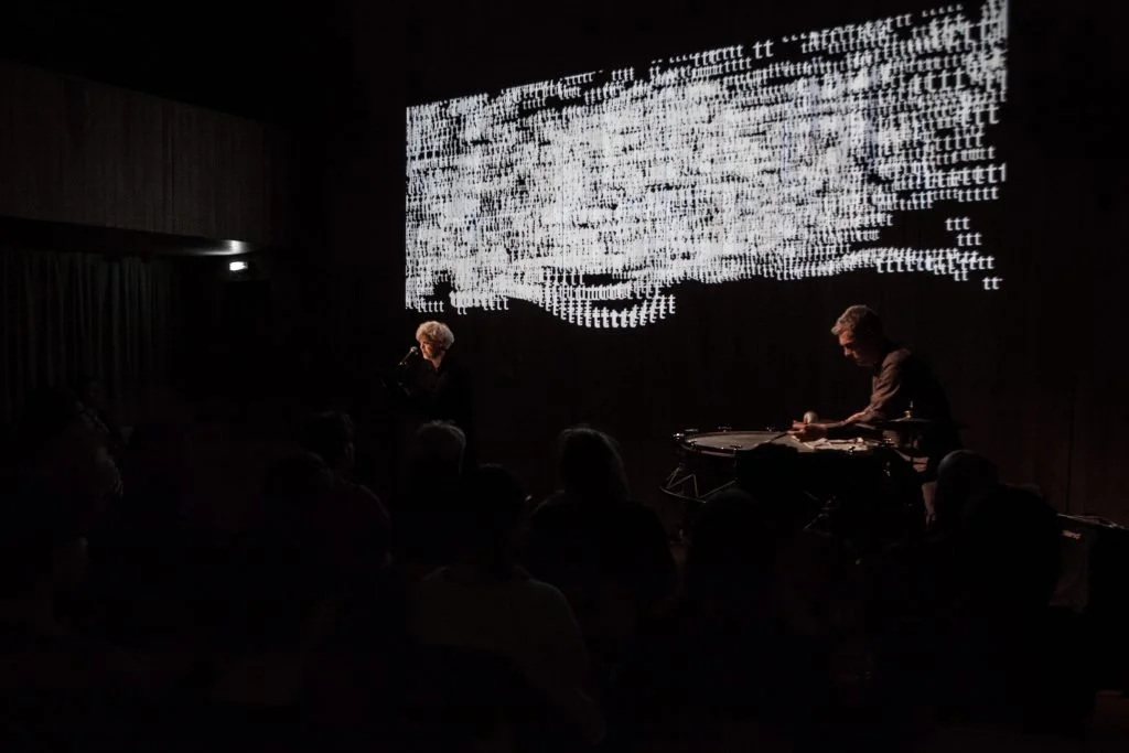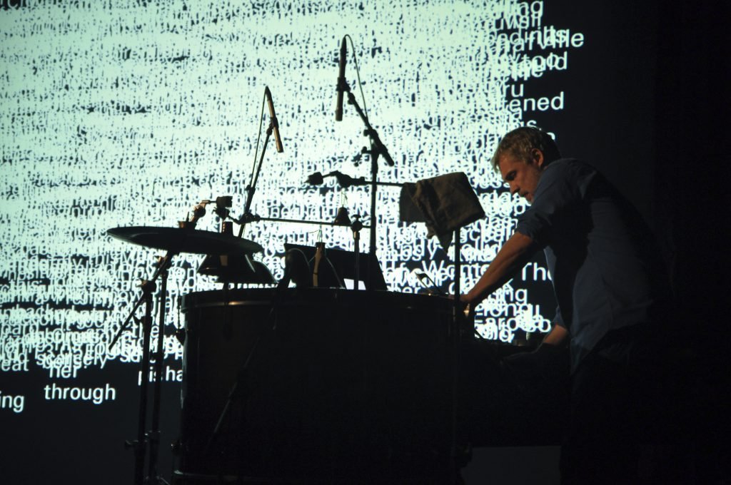 When performed in non-English speaking contexts some of this graphic text is translated into the main language of the region and integrated to the moving electronic projection. The beats, resonances and treated brushes of Ingar Zach’s subtle percussion work creates both a deeply meditative experience and a contemporary tribal pulse.