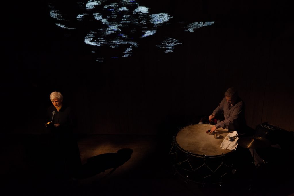Performance for spoken voice, electronic text & percussion