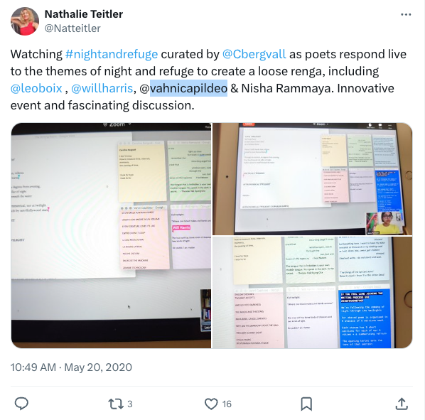 With Night & Refuge, my focus was to initiate a live writing event between a few UK based poets, open to the public. Due to Covid-19 it took place online.