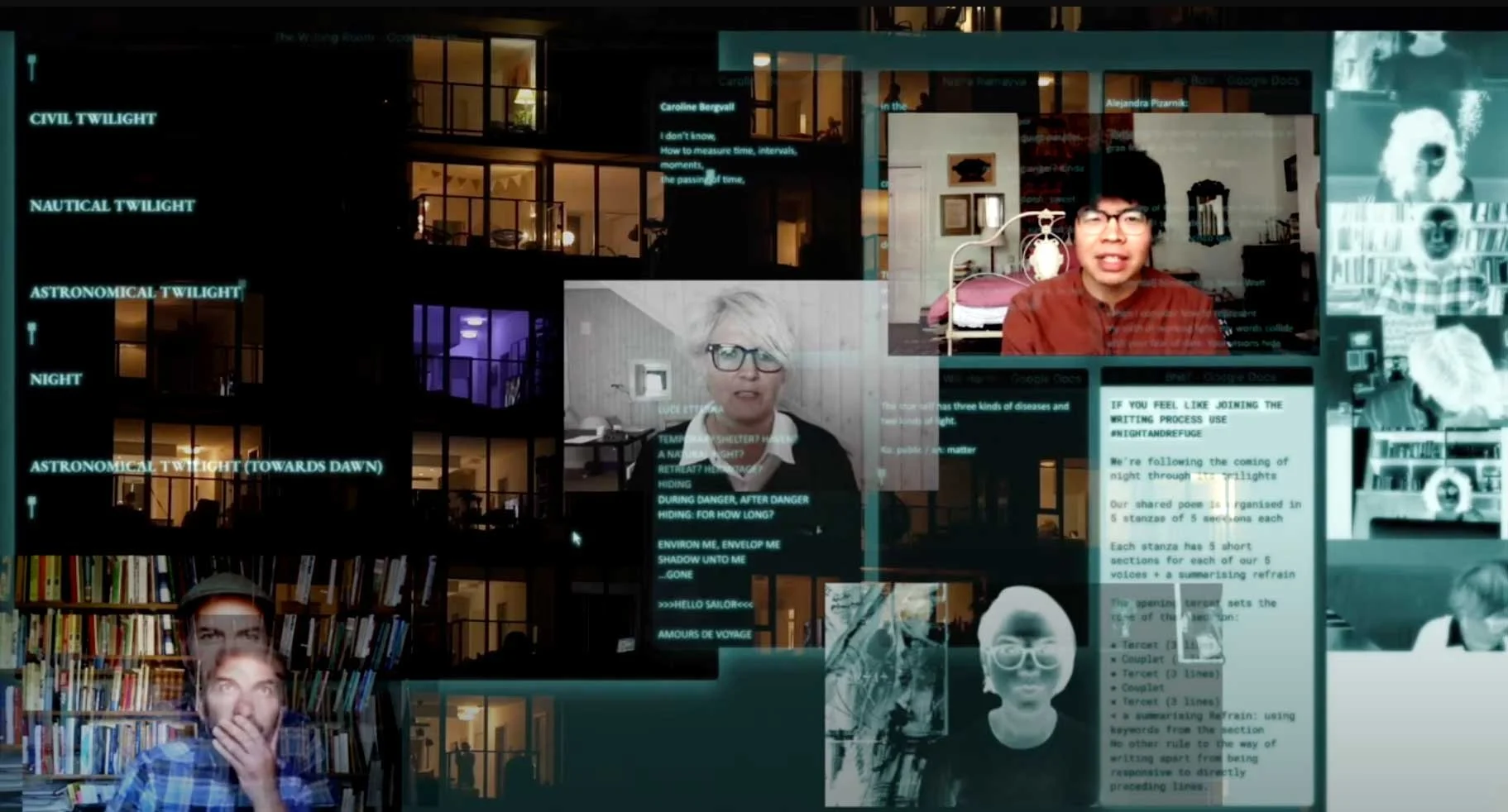 Open discussions accompanied the making of the poem: what is refuge, what of the night, its changing productivity, which constellations, how to write at this time of collective isolation, each with our complex sense of identity, of transhistorical hold and geo-mobilities.