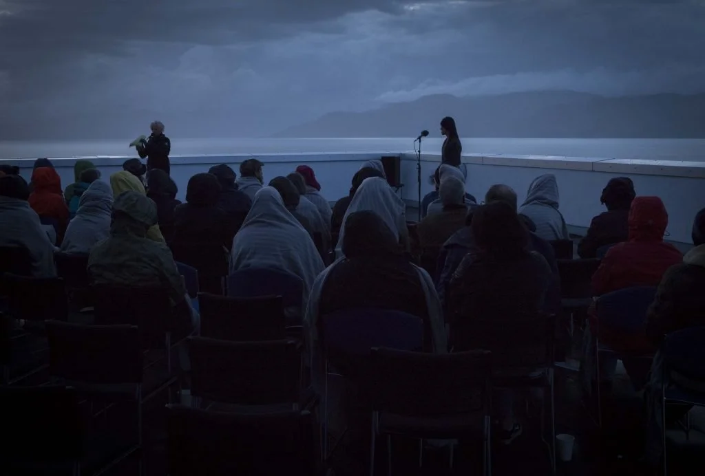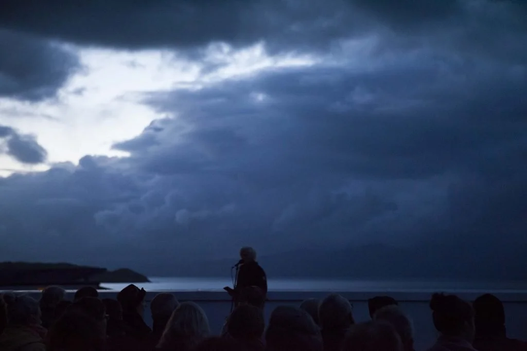 In 2018 we performed at two extraordinary sites: on the northermost coast of the Scottish Isles and in the harbour of France’s largest Southern city. Ragadawn 57°5 ’: Gaelic College, Isle of Skye: 25 August, 5:14am. Production partners: Atlas Arts/ Isle of Skye. Photos, performance and collective breakfast: Sophie Gerrard. Ragadawn 43°2’ : Mucem, Marseille: 5-6 October, 6.30 am. Venue partners: Actoral festival. Performing between the medieval fortress and the contemporary museum. Photo during perf. Marc Antoine Serra. After the performance/packing-up: team members. So far last performance, 9 March 2019, Western coast of Ireland, Galway 53°2’, a terrible storm forced us inside for the first time, large windows see the fierce dawn in, 2 days before European pandemic lockdown. Partners: Galway City of Culture 2019.
